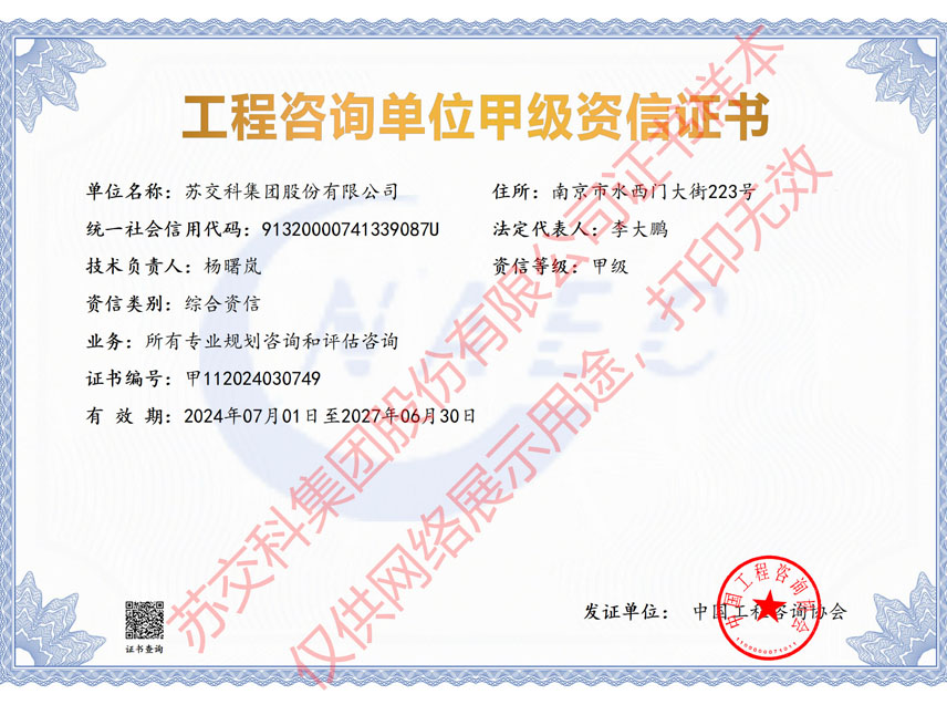 集團(tuán)資質(zhì)蘇交科擁有工程行業(yè)各領(lǐng)域甲級資質(zhì),包括城鄉(xiāng)規(guī)劃甲級資質(zhì);工程咨詢綜合甲級資質(zhì);工程咨詢專業(yè)甲級資質(zhì)(公路、生態(tài)建設(shè)和環(huán)境工程、水文地質(zhì)、工程測量、巖土工程、城市規(guī)劃、鐵路、城市軌道交通、港口河海工程、市政公用工程(市政交通、給排水)、水利工程、旅游工程);工程設(shè)計綜合甲級資質(zhì);工程勘察綜合類甲級資質(zhì);測繪甲級資質(zhì);公路工程和市政公用工程總承包一級資質(zhì);公路工程、水運(yùn)工程、市政公用工程監(jiān)理甲級資質(zhì);公路工程甲級、公路工程交通工程專項、水運(yùn)工程材料甲級和水運(yùn)工程結(jié)構(gòu)甲級試驗檢測資質(zhì)。