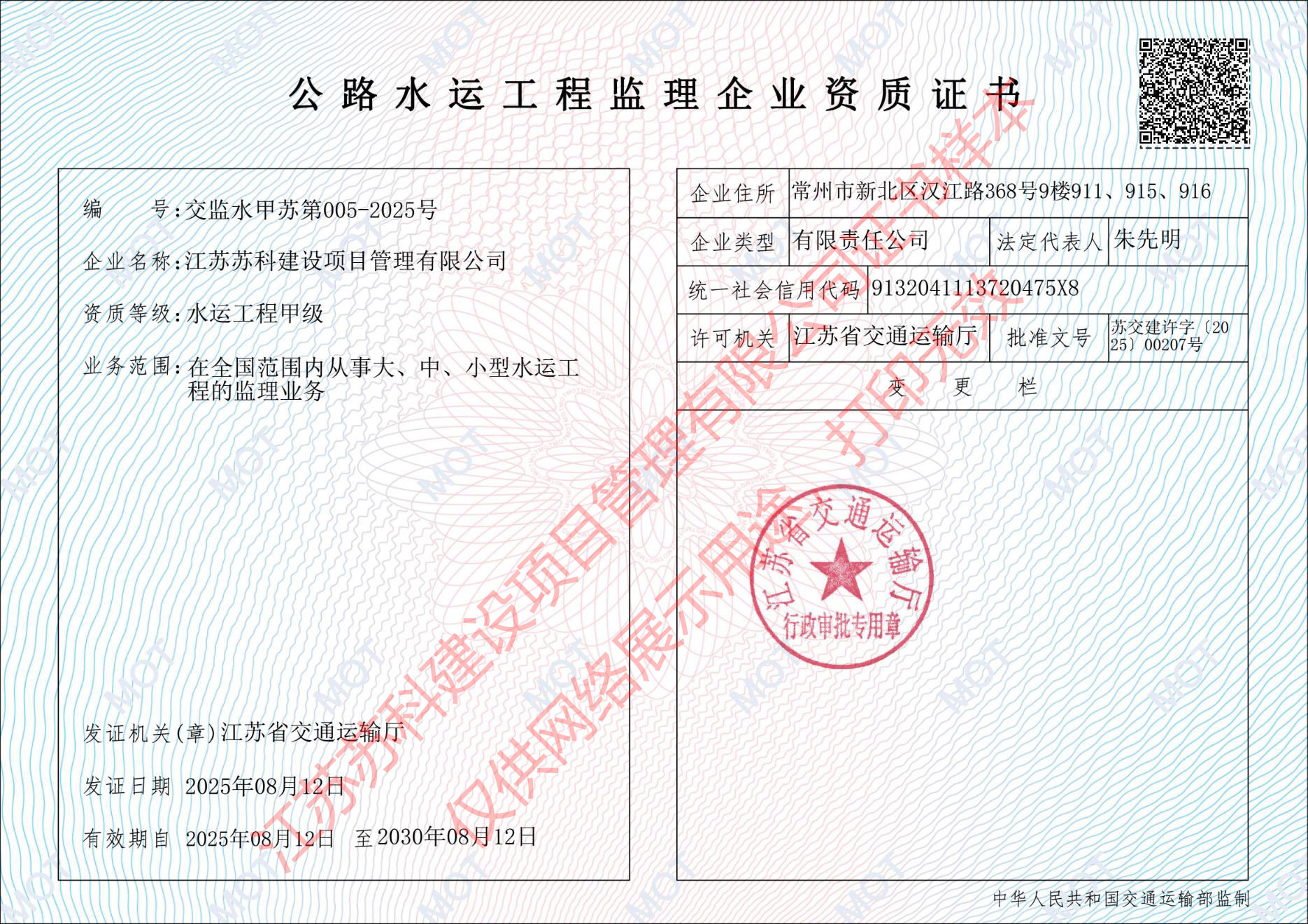蘇科建設(shè)工程監(jiān)理水運(yùn)工程資質(zhì)甲級