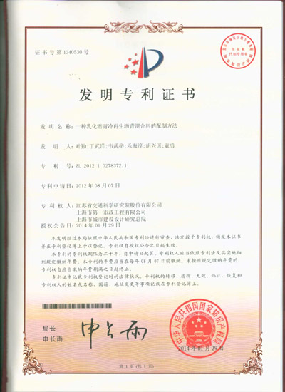 1月29日,由我公司自主研發(fā)的“乳化瀝青冷再生瀝青混合料的配制方法”通過(guò)國(guó)家知識(shí)產(chǎn)權(quán)局審查,被授予國(guó)家發(fā)明專(zhuān)利證書(shū)?! ∧壳肮こ?..